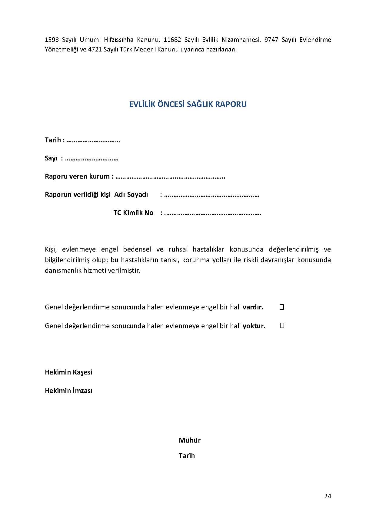 Halk Sağlığı Genel Müdürlüğü, Kadın ve Üreme Sağlığı Daire Başkanlığı’nın 2013 yılında yayımlamış olduğu “Evlilik Öncesi Muayene ve Danışmanlık Rehberi“nin 24üncü sayfasında “1593 Sayılı Umumi Hıfzıssıhha Kanunu, 11682 Sayılı Evlilik Nizamnamesi, 9747 Sayılı Evlendirme Yönetmeliği ve 4721 Sayılı Türk Medeni Kanunu uyarınca hazırlanan” üst bilgisi ile “Evlilik Öncesi Sağlık Raporu” yer almaktadır. Ancak bu rapor formatı bilinmeyen nedenlerden dolayı yaygınlaşmamıştır.